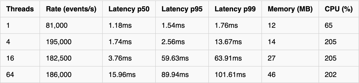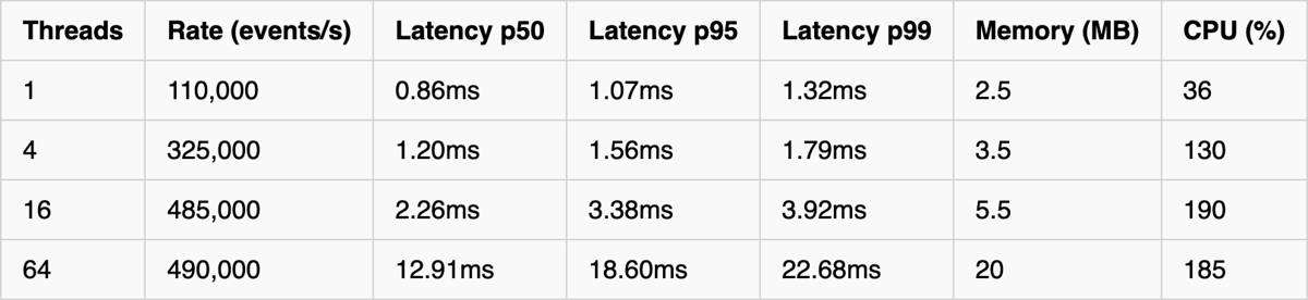 In this test, Rust delivered ~2.5x higher throughput (490k vs 185k events/s at peak), ~3-5x lower memory usage, and more stable latency under the high load. Go's latency degraded dramatically at 16+ threads (p95: 60ms vs 3.4ms), but was better at low volume of load.